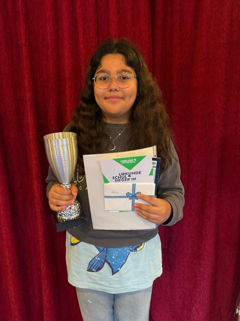 Jeder durfte 2 Freundinnen mitbringen, was für zusätzliche Unterstützung und eine besonders herzliche Atmosphäre sorgte. Nach einer knappen Entscheidung stand schließlich die Schulsiegerin fest: Sakina Guliyev (6d) begeisterte mit einer lebendigen Leseleistung und wurde von der Jury sowie dem Publikum gefeiert.
